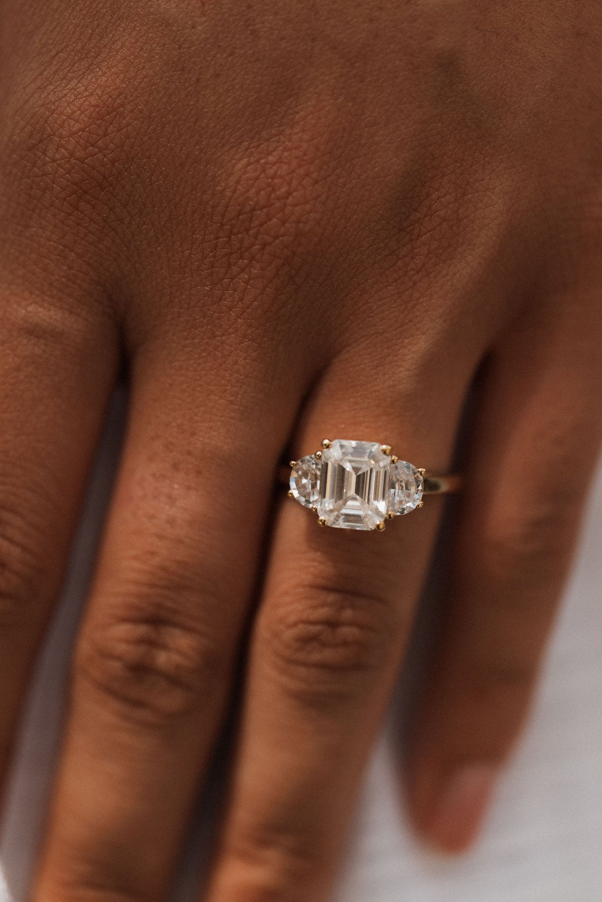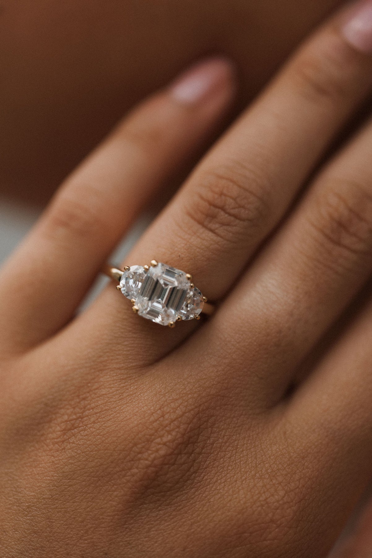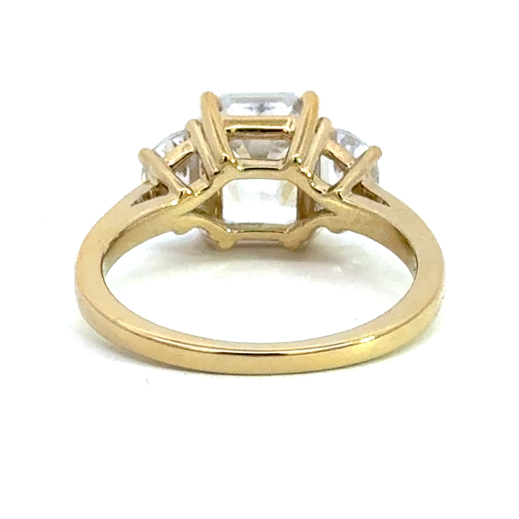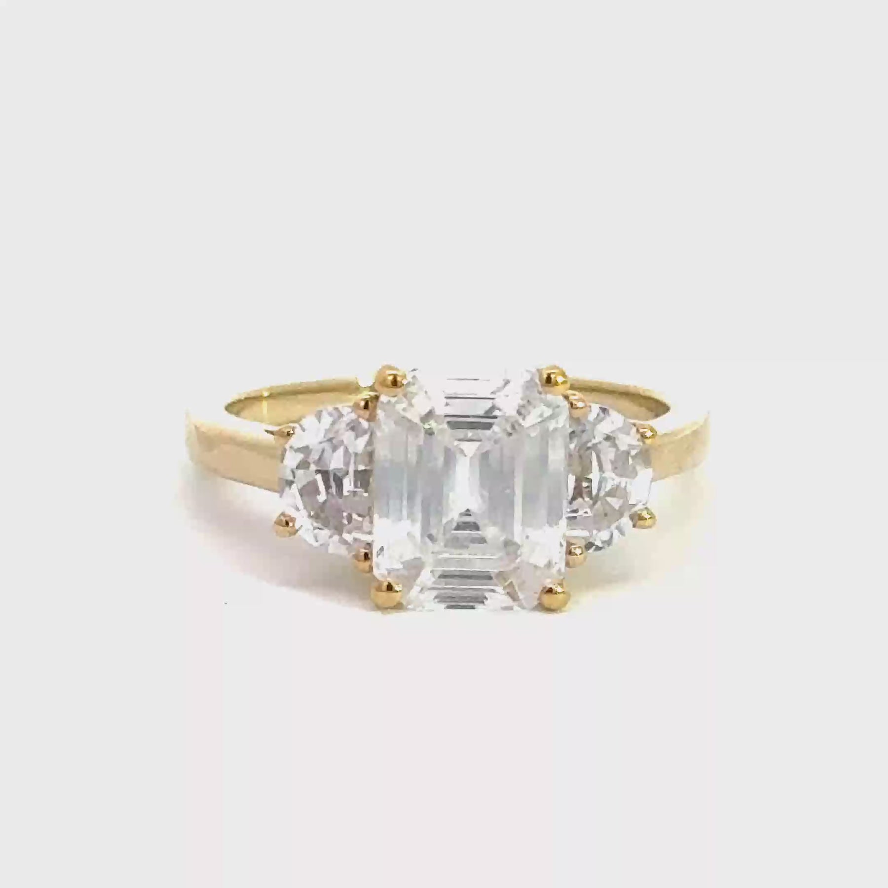 4.0 ctw emerald-cut diamond three-stone mezzaluna half-moon engagement ring