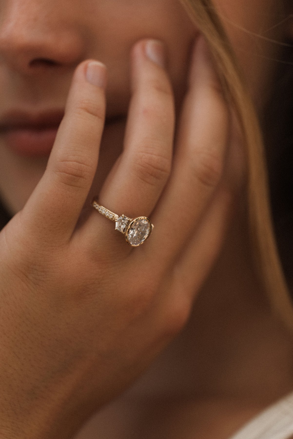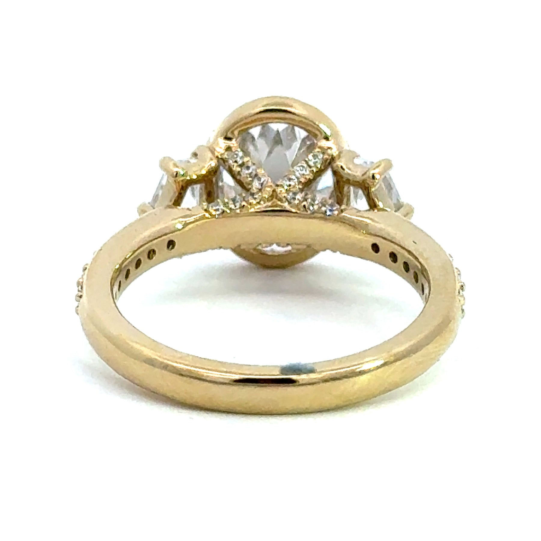 4.1 ctw oval diamond three-stone bezel pentagon with pave band engagement ring
