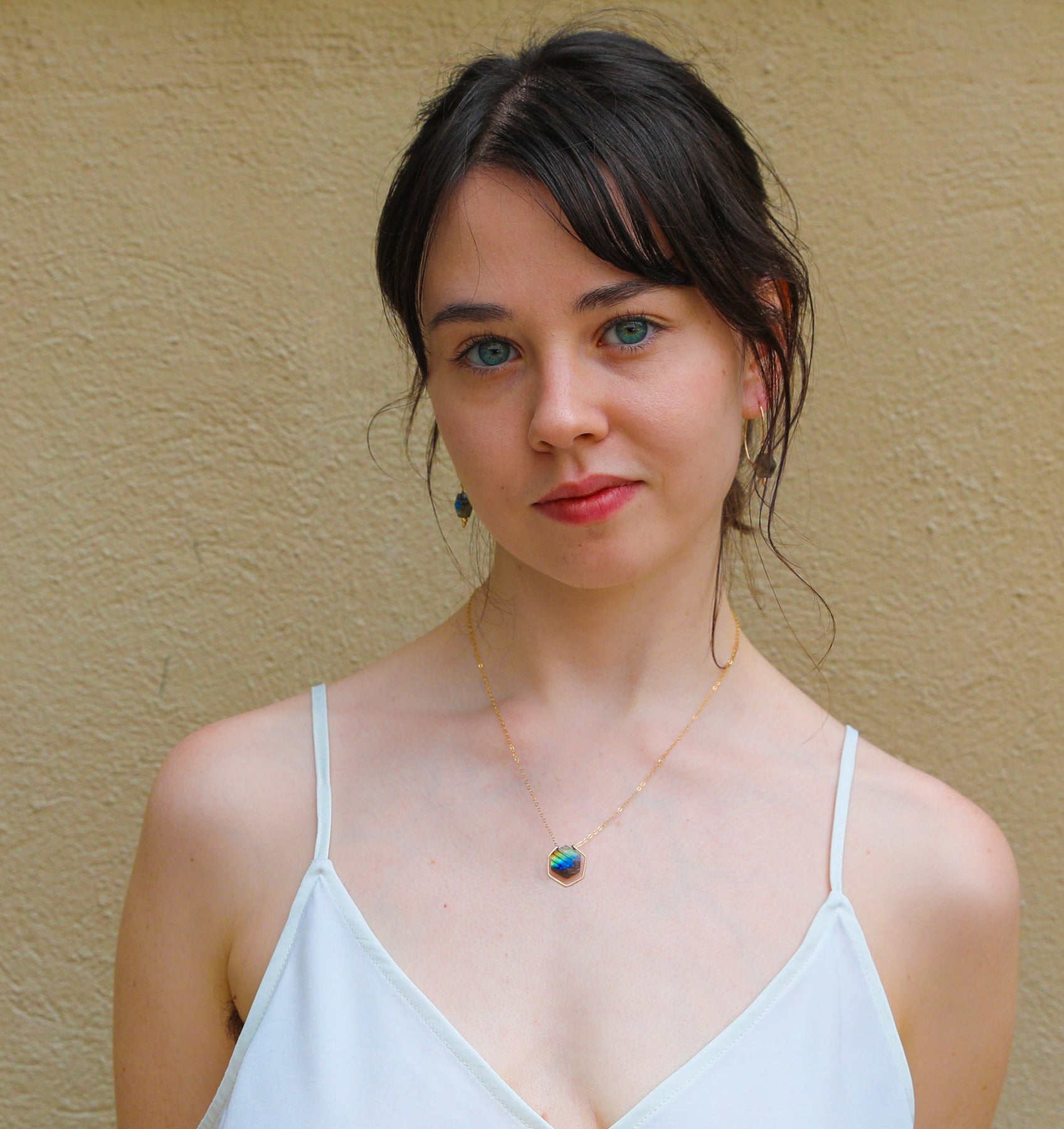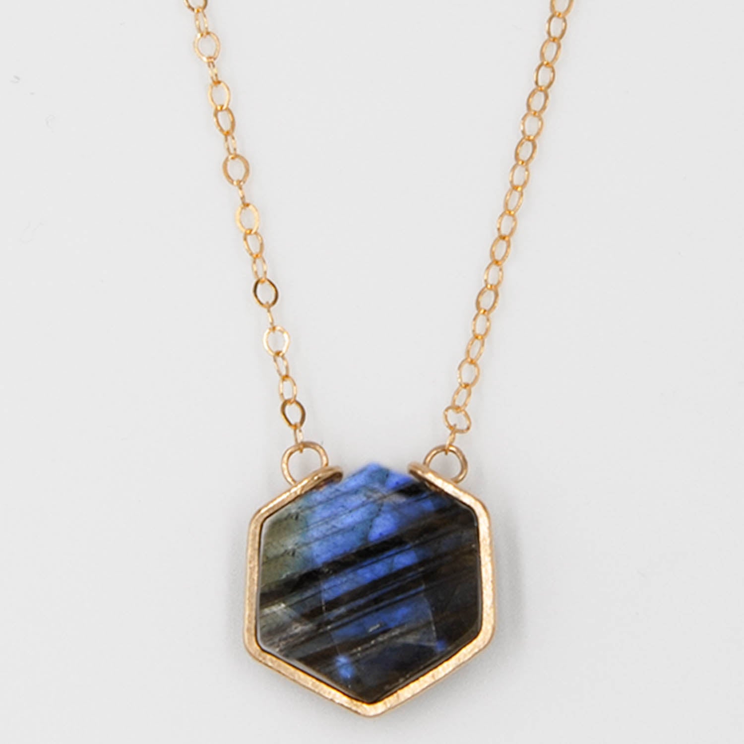 Inspired by Iceland's aurora borealis, our Northern Lights collection features natural labradorite in unexpected geometric shapes complemented with hand-hammered 14K metal frames and details. These gemstones have a brilliant iridescence - reflecting light with flashes of blue and green.