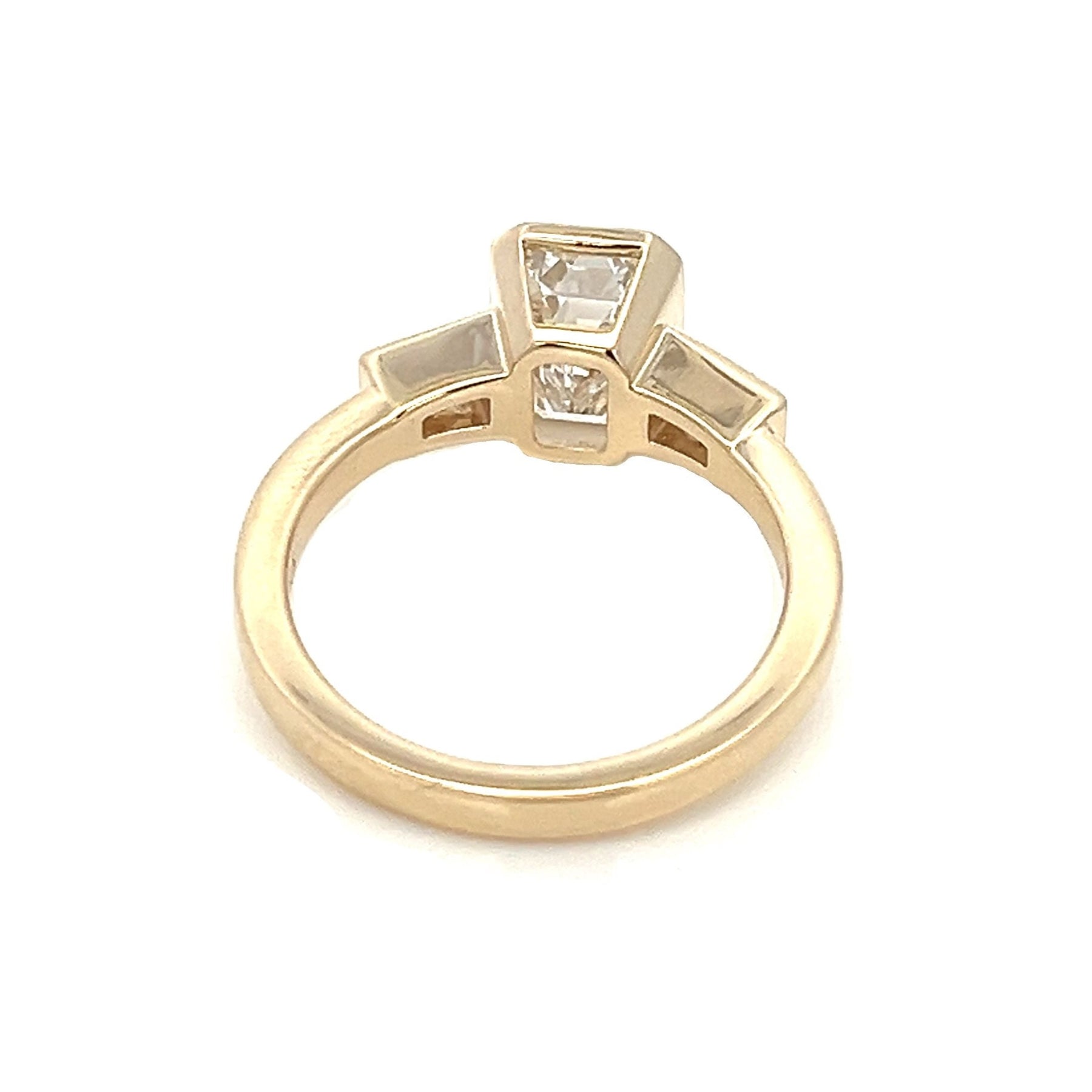 three-stone emerald cut diamond bezel set engagement ring