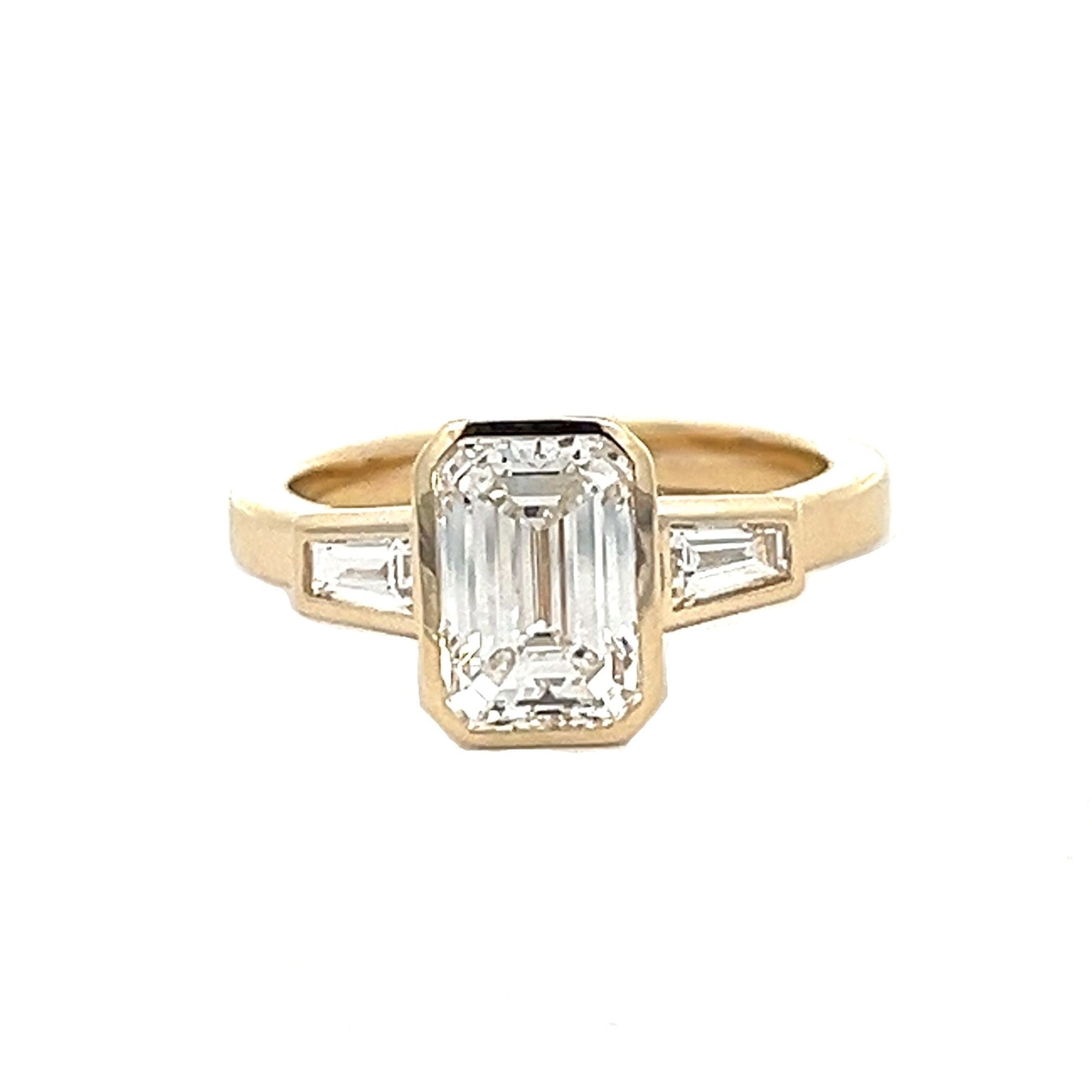 2 ctw emerald-cut diamond center stone paired with two tapered diamond baguettes